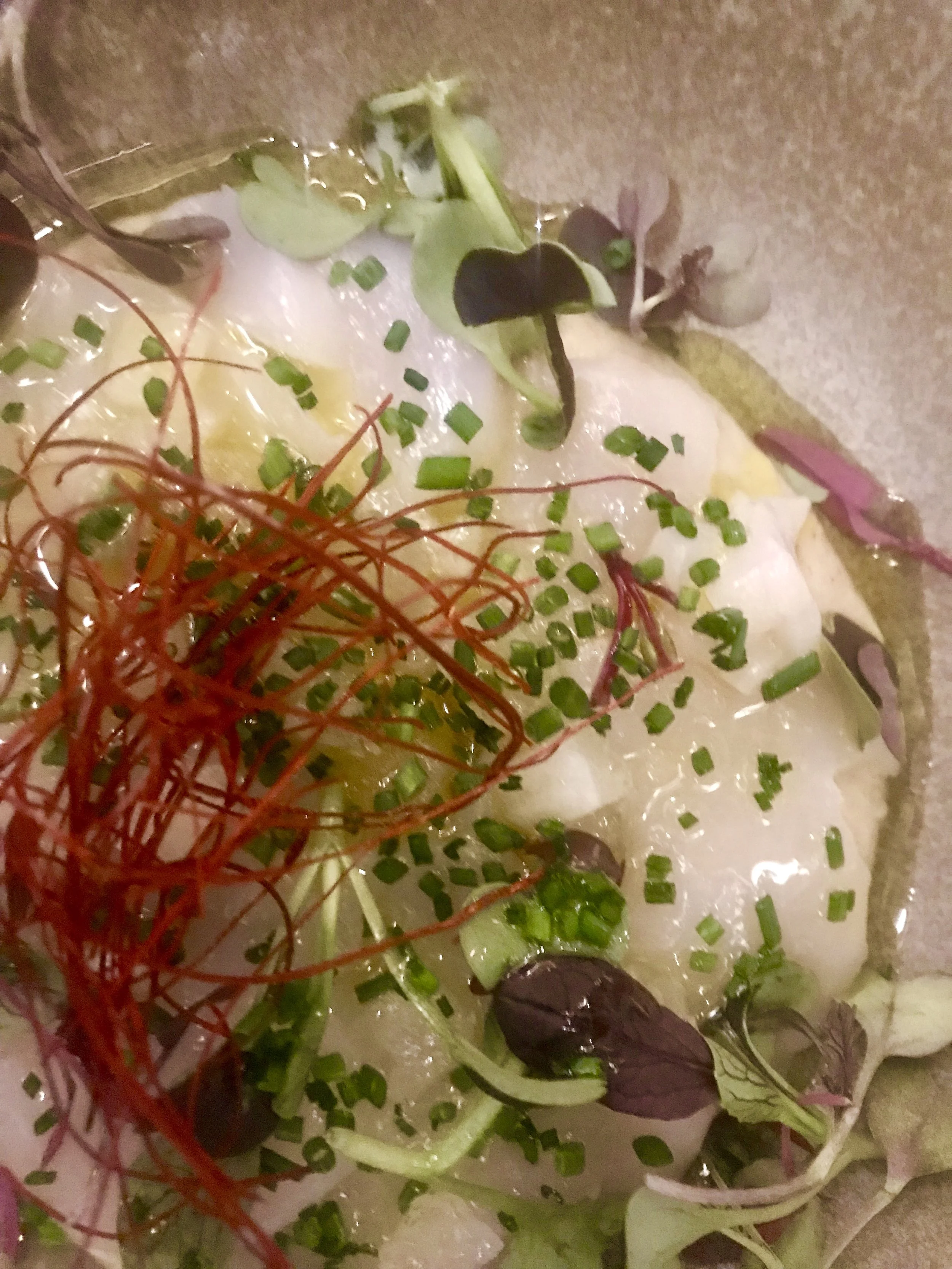 Upscale dining in Barcelona served up this house special - a raw carpaccio of codfish. The red threads are akin to saffron.