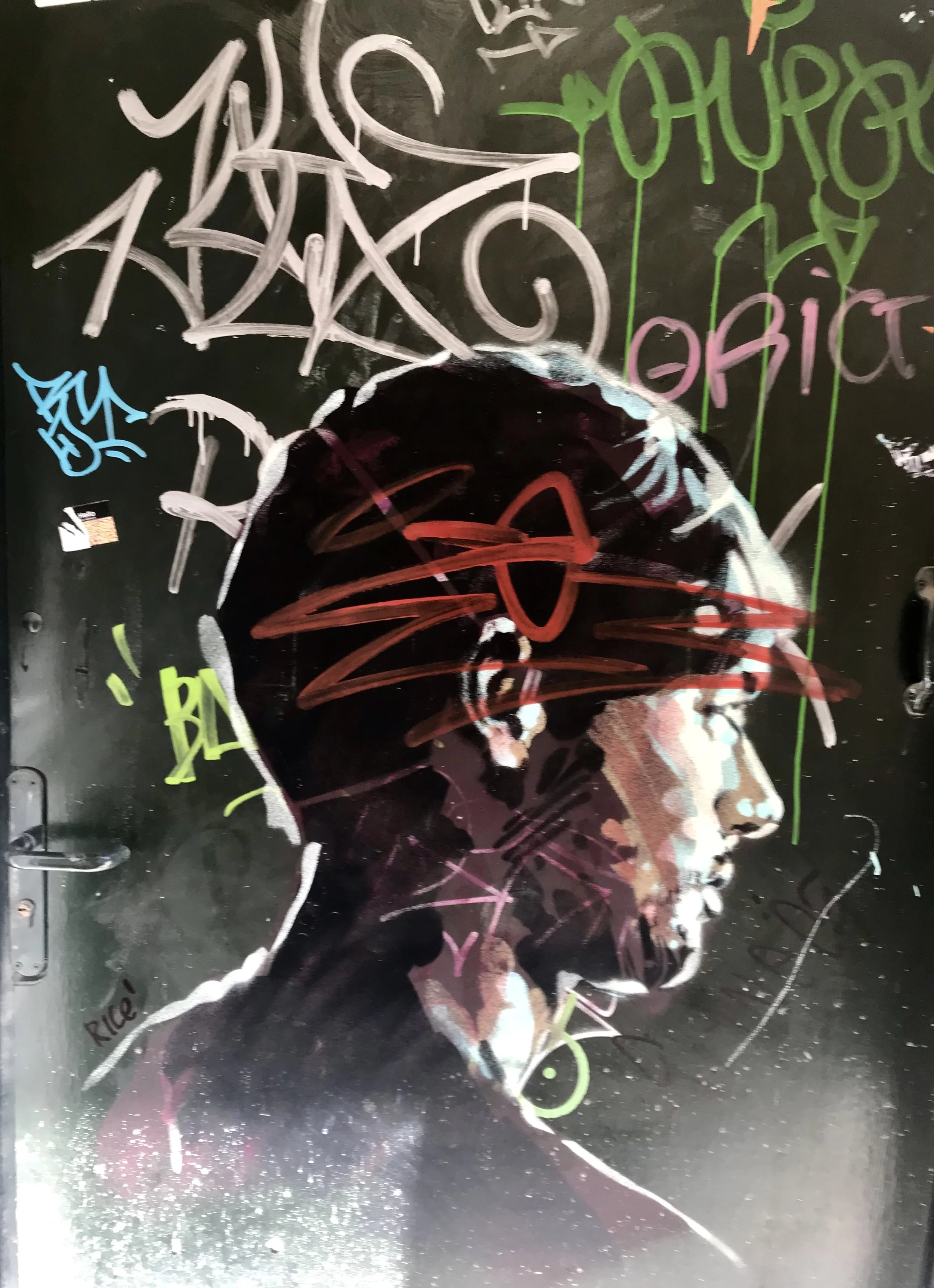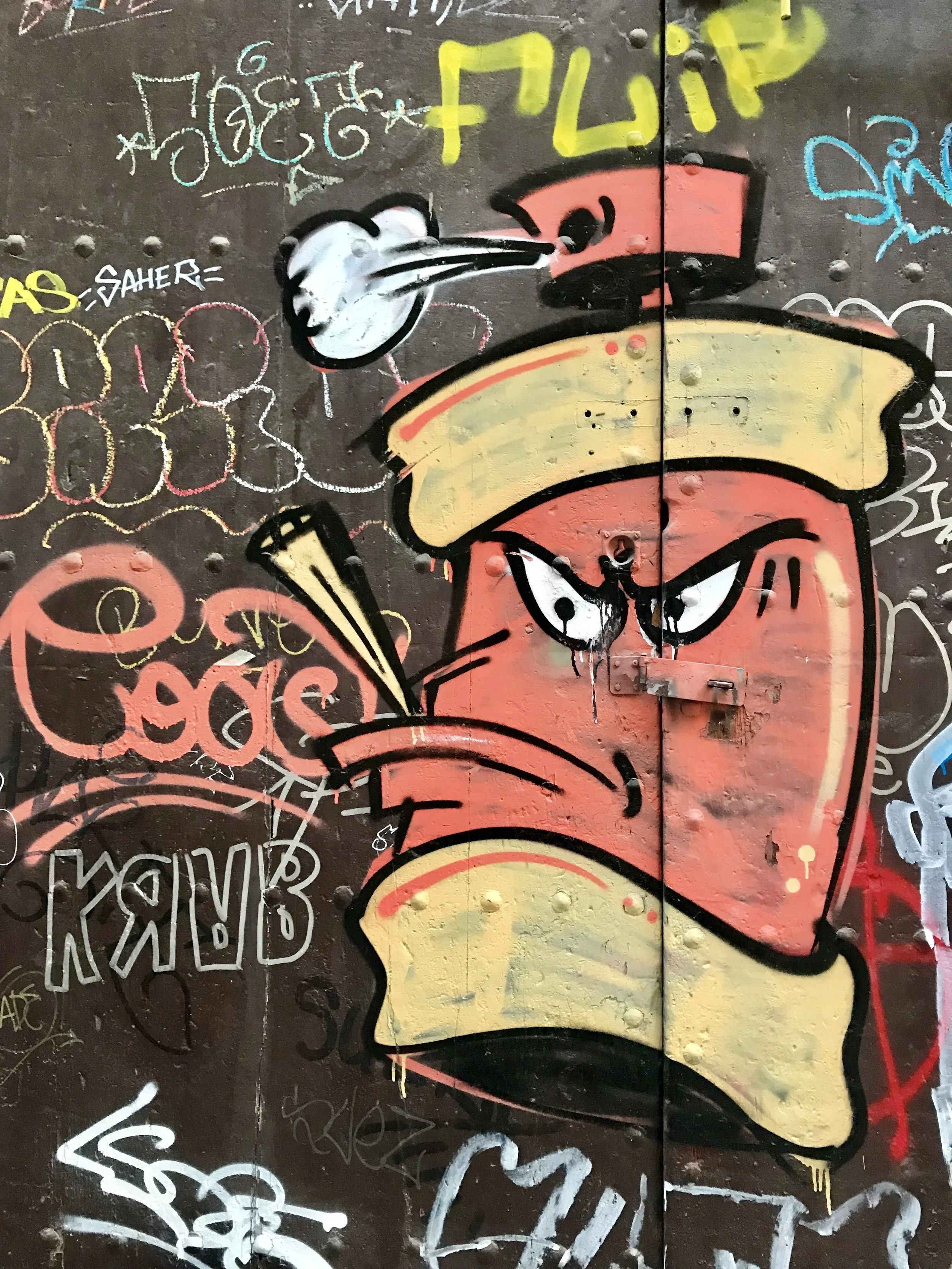 Just about everywhere there are strong graphic statements. They are covered with banners, handwritten, spray painted, or stenciled with signs and symbols (such as yellow ribbons), murals, paintings, posters, and graffiti art. And since storefronts are covered with grates to cover doors and windows, they are sometimes used for advertising. Often times the shutters are artistically painted. Even residential buildings sometimes have wonderfully painted doors.