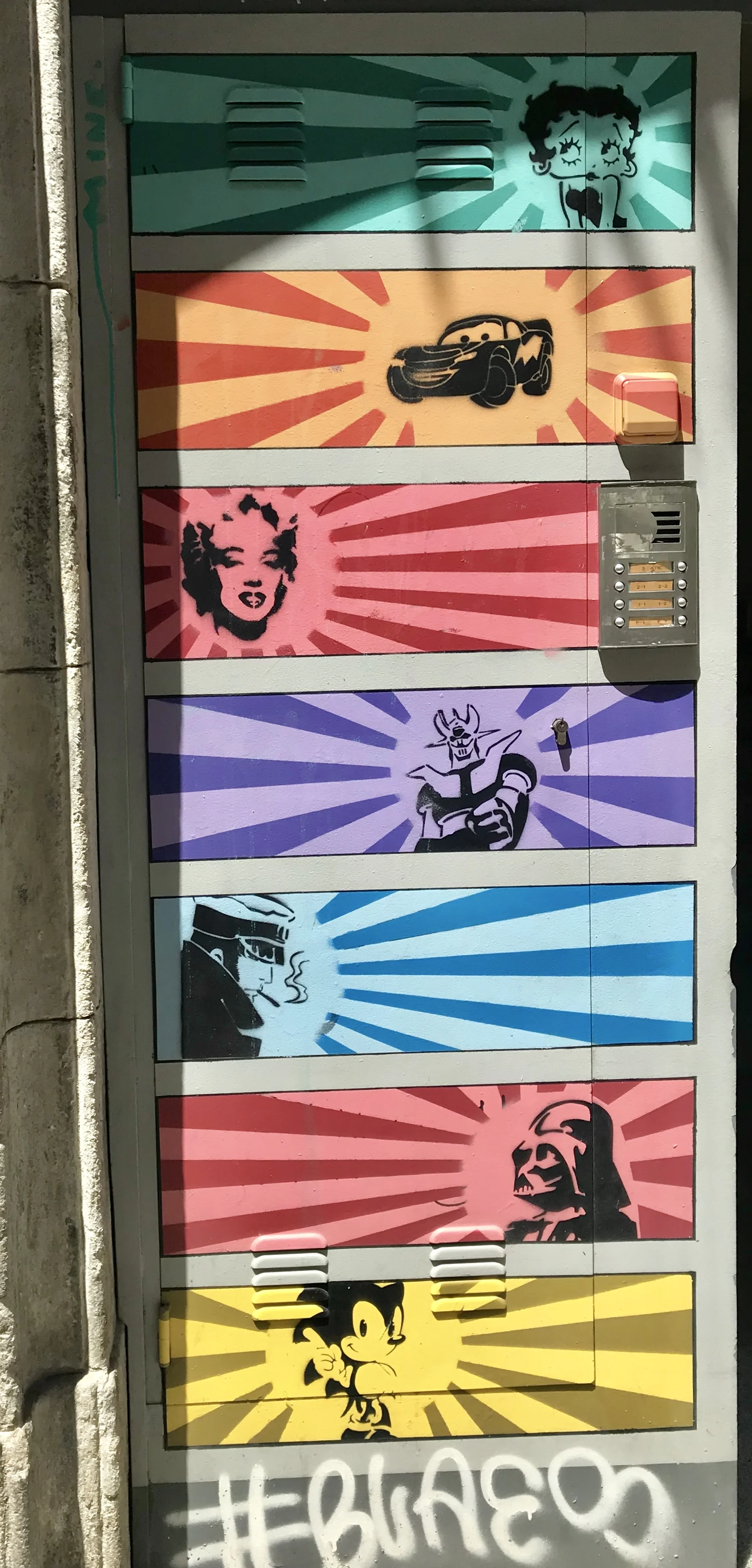 A kitschy art doorway using a great palette.