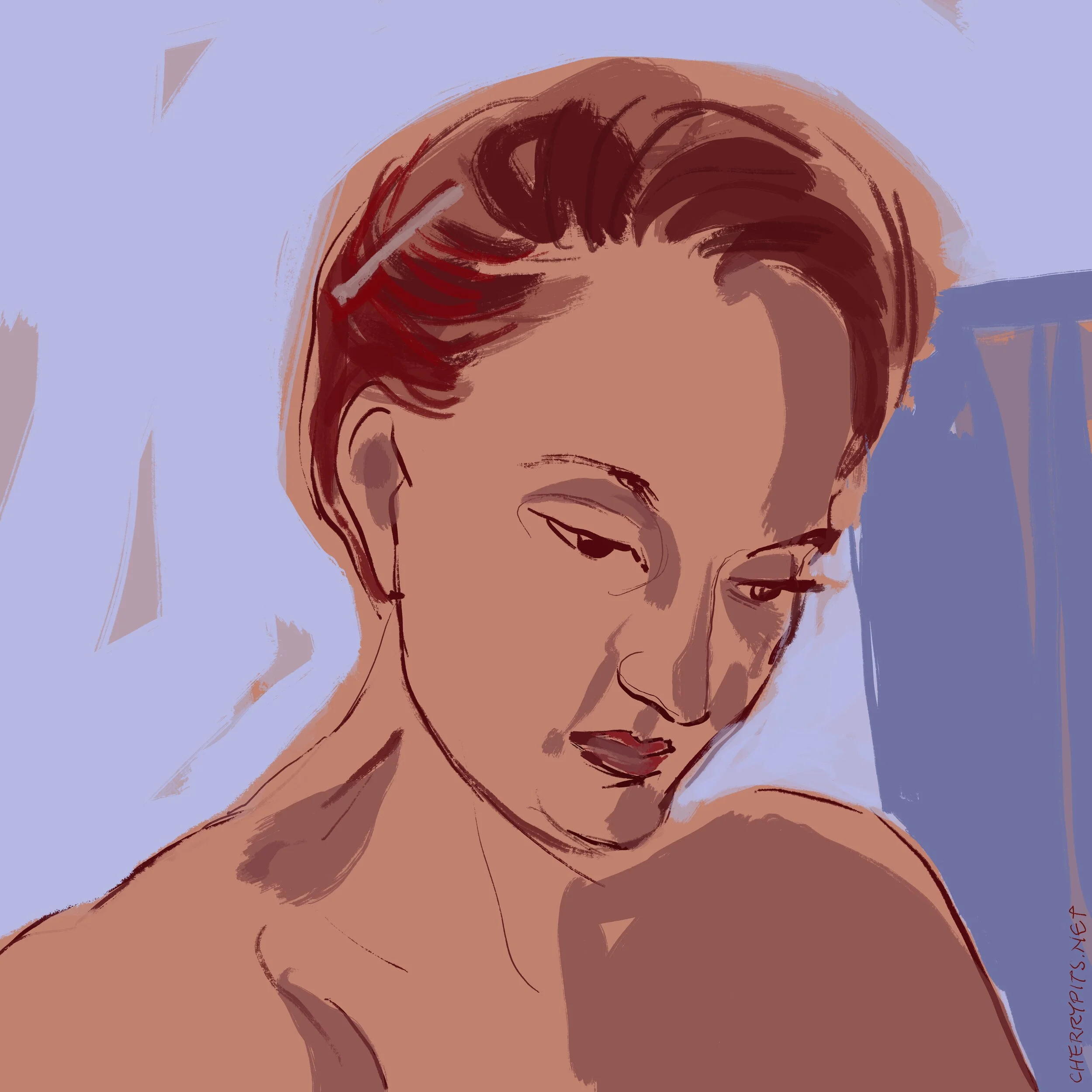 This drawing of Kyla encountered the female “Nipple Rule”. I might have key worded in “trans” and set off an alarm.