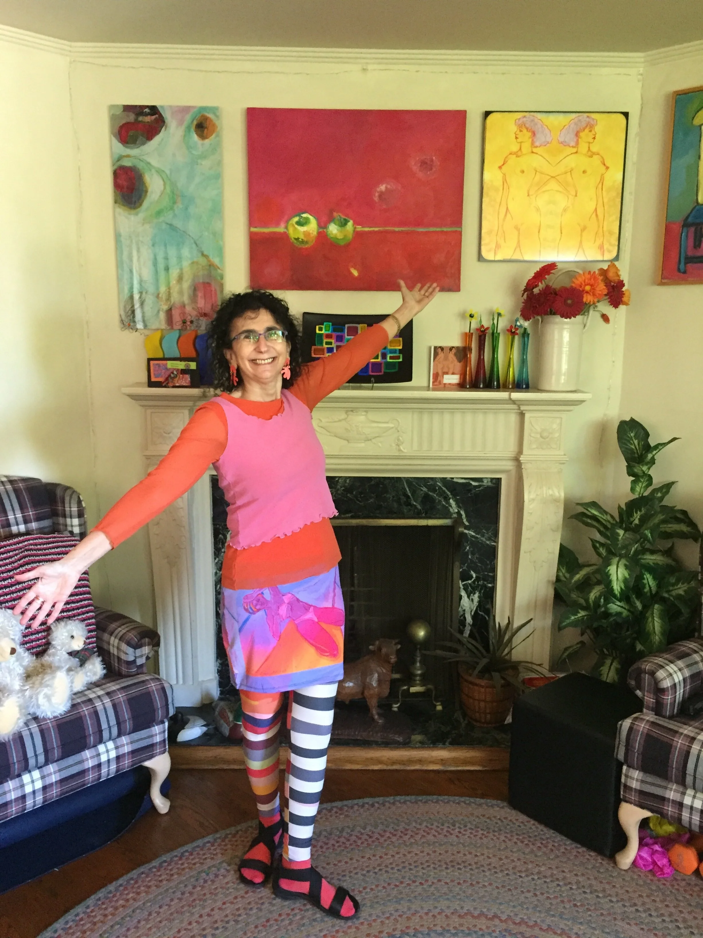My art friend and patron Kris visiting my studio during Open Studios. She’s wearing my art mask and leggings titled Woman on Fire!