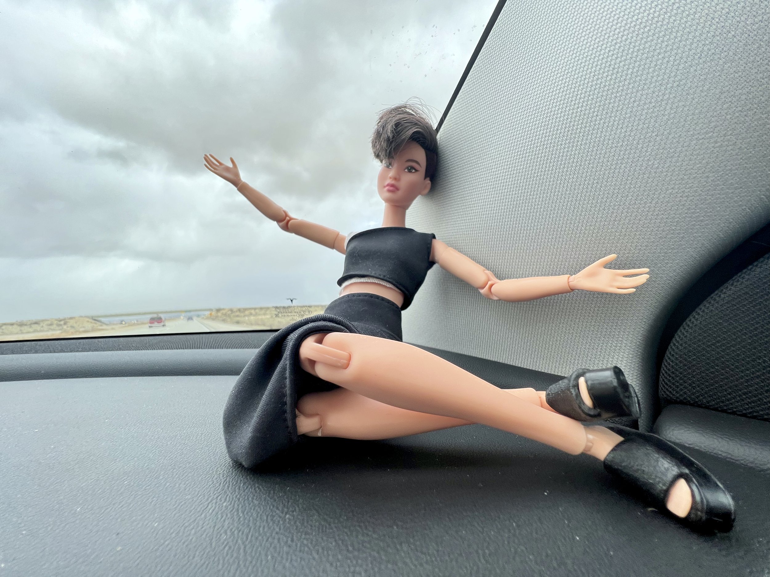 Here I am at our hotel heading out to CDMX ARTWEEK and Art Fairs (Zona Maco and more!) Feb 4-10, 2025. Yes, that’s a Barbie I’m holding, my iconic companion. And that’s my artwear, everywhere.