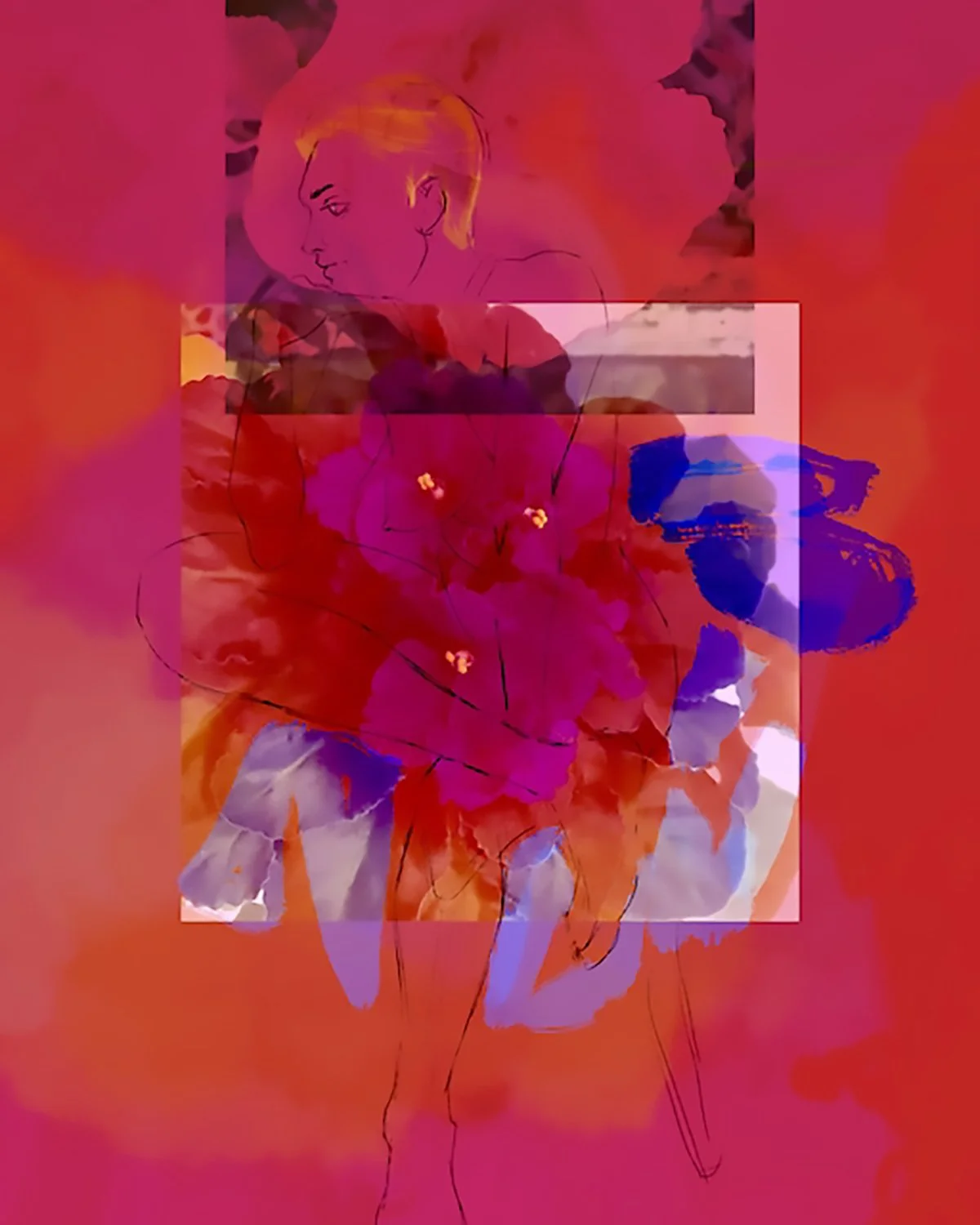 I’ve been studying printmaking at GAW in SF with Mark Brodie. This is one in a new series akin to monoprinting and collage. I’ve printed a photopolymer plate (left side) onto a vintage Japanese hankie, then a solid pink (right side) using an acrylic plate, and using chine colle technique I’ve added a rectangle of Japanese paper (top right). Three runs through the press so far. Created in July 2025.